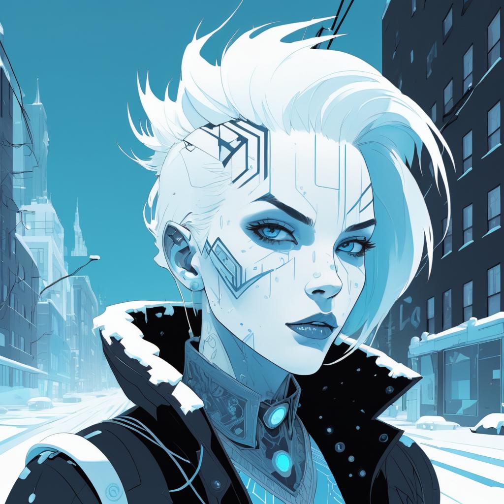 Highly detailed digital portrait of a female cyberpunk android with snowy elemental and witch-like features. The character has white hair styled in a punk fashion, intricate robotic patterns and wiring on her pale blue skin, and wears a dark high-collared coat. The background showcases a dystopian, snow-covered glaciated cityscape with muted blue, cyan, black, and white tones.
