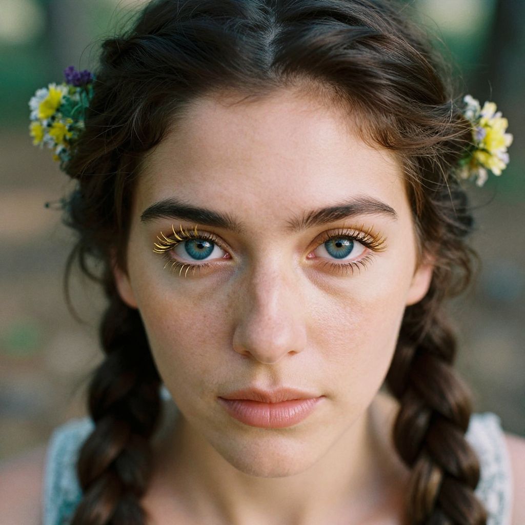 Photograph of a young woman with fair skin and blue eyes, staring directly at the camera with a neutral expression. She has dark brown, wavy hair styled in two braids, adorned with small yellow and purple flowers. Her long eyelashes are prominent, and she has a few freckles on her cheeks. She wears a white, slightly visible top. The background is blurred, suggesting an outdoor setting with greenery. The image has a shallow depth of field, focusing sharply on her face while the background remains out of focus. The lighting is natural, highlighting her facial features.