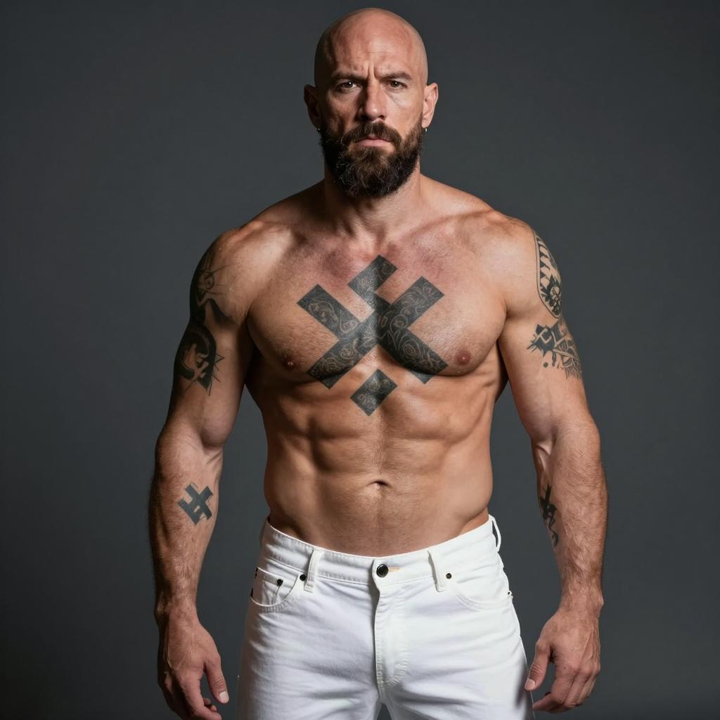 Shirtless man with a bald head, beard, and tattoos on his arms stands with hands behind his head. Black swastika tattoo on his chest. Wearing white pants. Two police officers in the background, one on the left and one on the right. White and silver cars behind them. Nighttime setting.