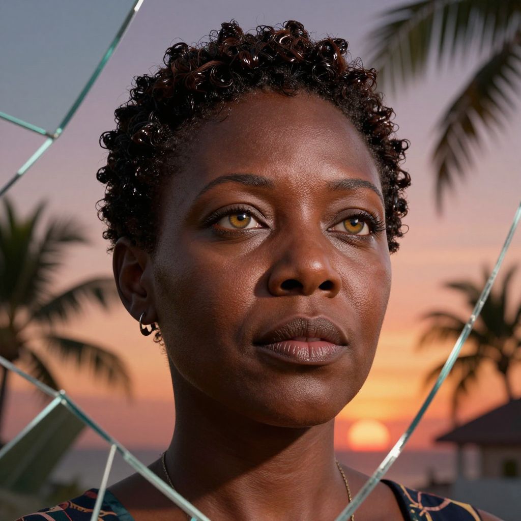 Photograph of a dark-skinned, curly-haired woman with golden eyes, wearing a patterned shirt, framed by broken glass against a sunset with palm