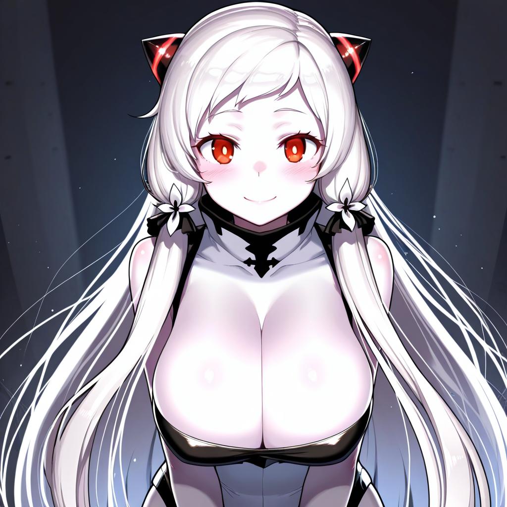 Airfield princess, kantai collection, 1girl, white skin, pale skin, horns, red eyes, white hair, very long hair, long hair, large breasts, by artist leonat, illustrious
