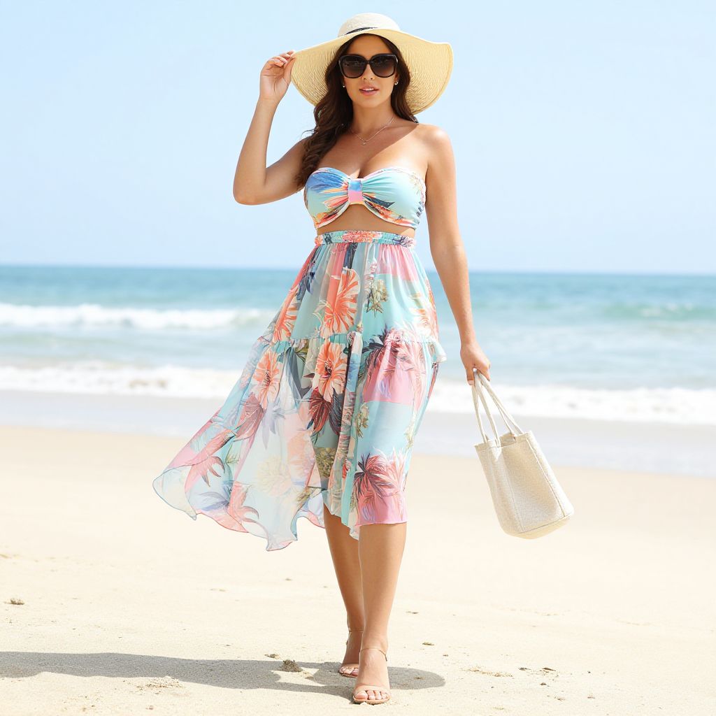 Photograph of a woman in a colorful floral sundress, straw hat, sunglasses, and sandals, walking on a sunny beach, holding a white tote