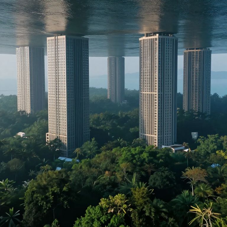Photograph of a futuristic urban landscape featuring four tall, cylindrical skyscrapers with reflective, glass-covered exteriors rising from a dense, green forest. Each skyscraper is supported by a thick, water-filled, dark gray base that resembles a giant dam. The buildings are evenly spaced and cast subtle reflections on the water. The forest below is lush with various trees, including palm trees, and small white buildings are scattered among the greenery. The sky is clear and blue, creating a contrast with the dark water bases and green foliage. The scene is highly detailed, with sharp contrasts between the modern architecture and natural environment.