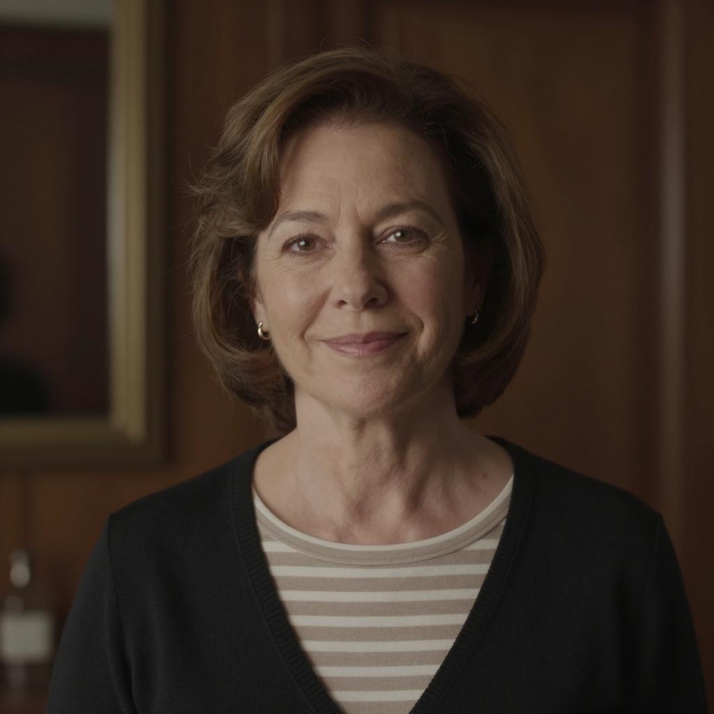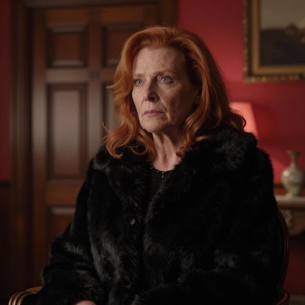 Photograph of a middle-aged woman with light skin and shoulder-length brown hair, holding a revolver in each hand, wearing a gray turtleneck and dark cardigan, looking determined. Background: dimly lit room with a brass light fixture.