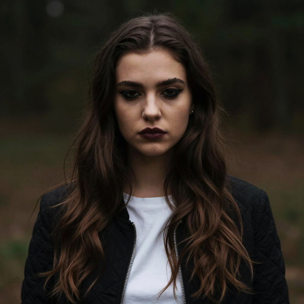 Photograph of a young woman with long, wavy, dark brown hair and fair skin. She's wearing a black quilted jacket over a white shirt, with dramatic black eyeliner and dark lipstick. Her expression is serious and downcast. The background is blurred, featuring dark green and brown hues, suggesting an outdoor, wooded setting. The lighting is soft, creating a moody atmosphere.
