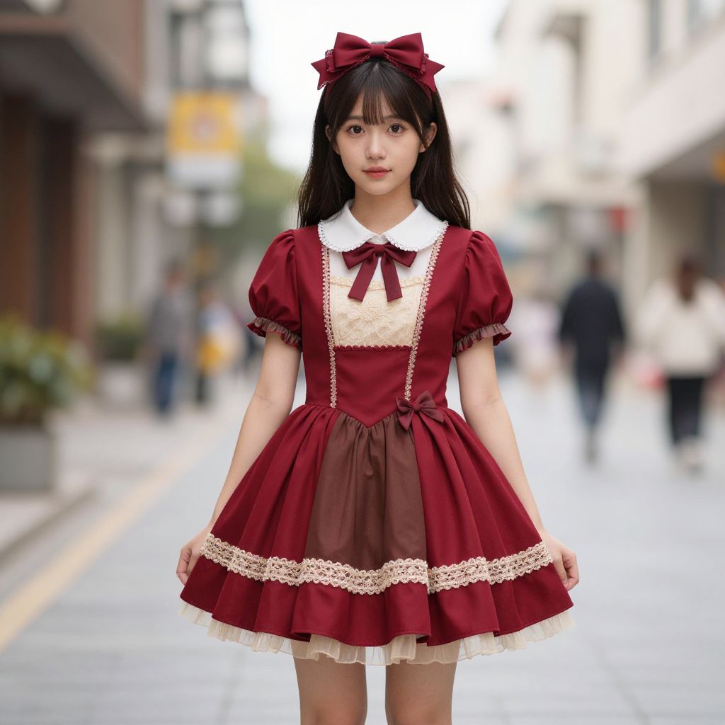 Photograph of an Asian woman with long black hair, wearing a maroon Lolita-style dress with white lace trim, red bow, and white collar
