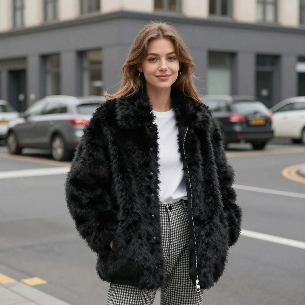 Photograph of a young woman standing on a city street. She has light brown hair, fair skin, and is smiling slightly. She's wearing a fluffy, black, oversized fur jacket over a white top and checkered pants. The background shows a gray, modern building with parked cars and a slightly blurred urban setting. The lighting is natural, and the overall style is casual and chic.