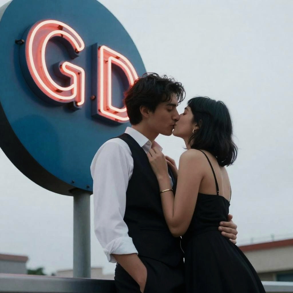 Romantic Rooftop Kiss with Neon Vibes