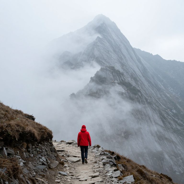 A solitary figure traverses a rugged mountain path, their vibrant red jacket a beacon of resilience against the vast, ethereal expanse of towering peaks shrouded in mist, evoking a profound sense of solitude, freedom, and the timeless dance between humanity and nature's infinite mystery.