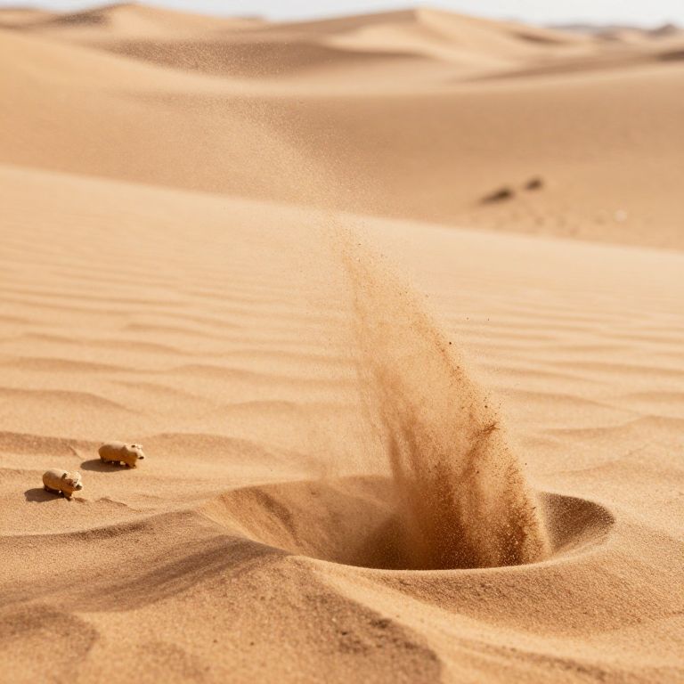 A desert where sand changes shape mid-fall, morphing into tiny animals, then falling again as ordinary grains.