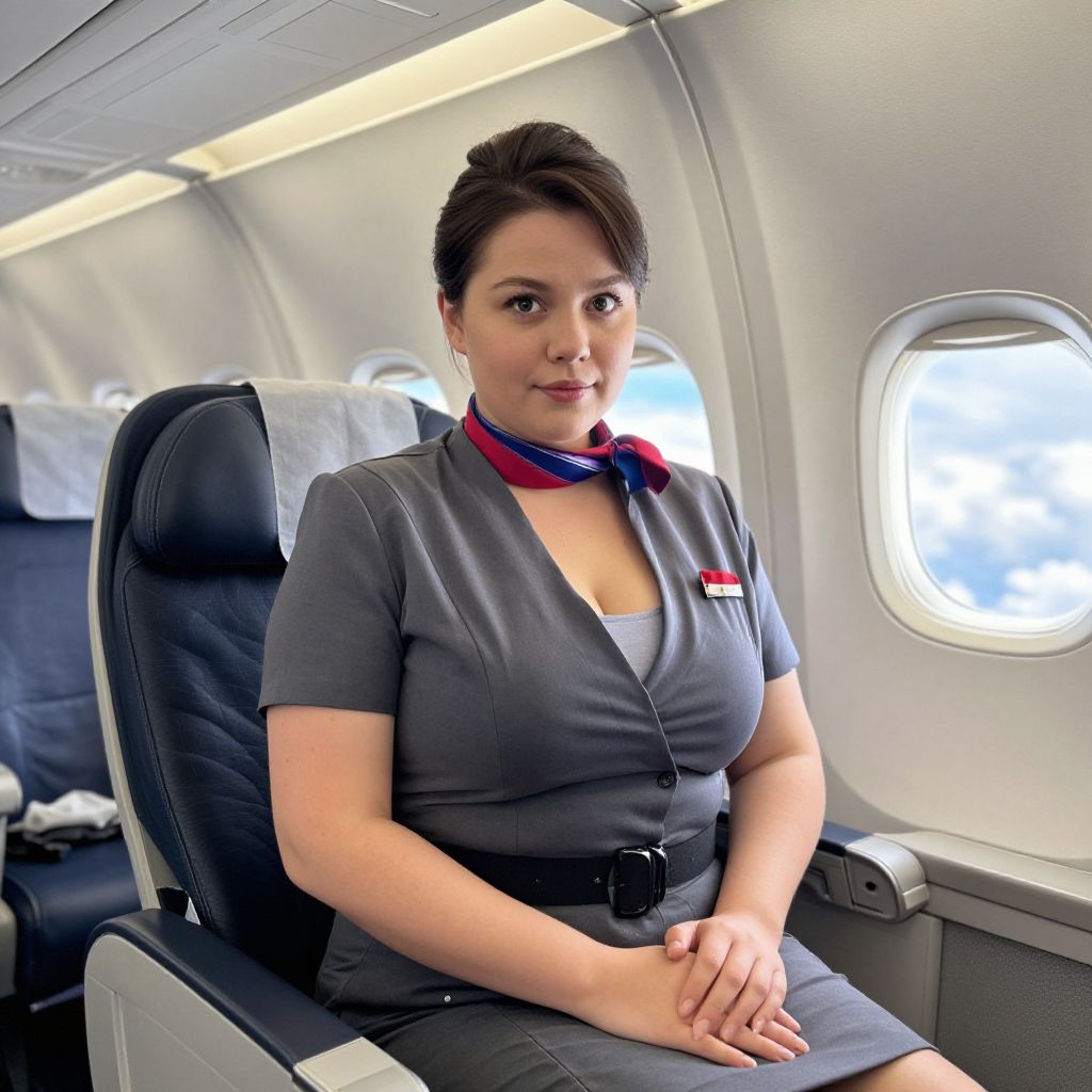 A well-lit, candid-style photo of a plus-size flight attendant in a stylish, modern airline costume featuring a sleek gray jumpsuit with a red pocket square and metallic trim, seated in a first-class passenger seat in a full flight simulation environment, the woman has a soft, natural look with fair skin, wide eyes, and a composed facial expression, the setting shows a detailed interior of a modern aircraft cabin with a window view of a cloudy sky. The woman has big breasts and cute face