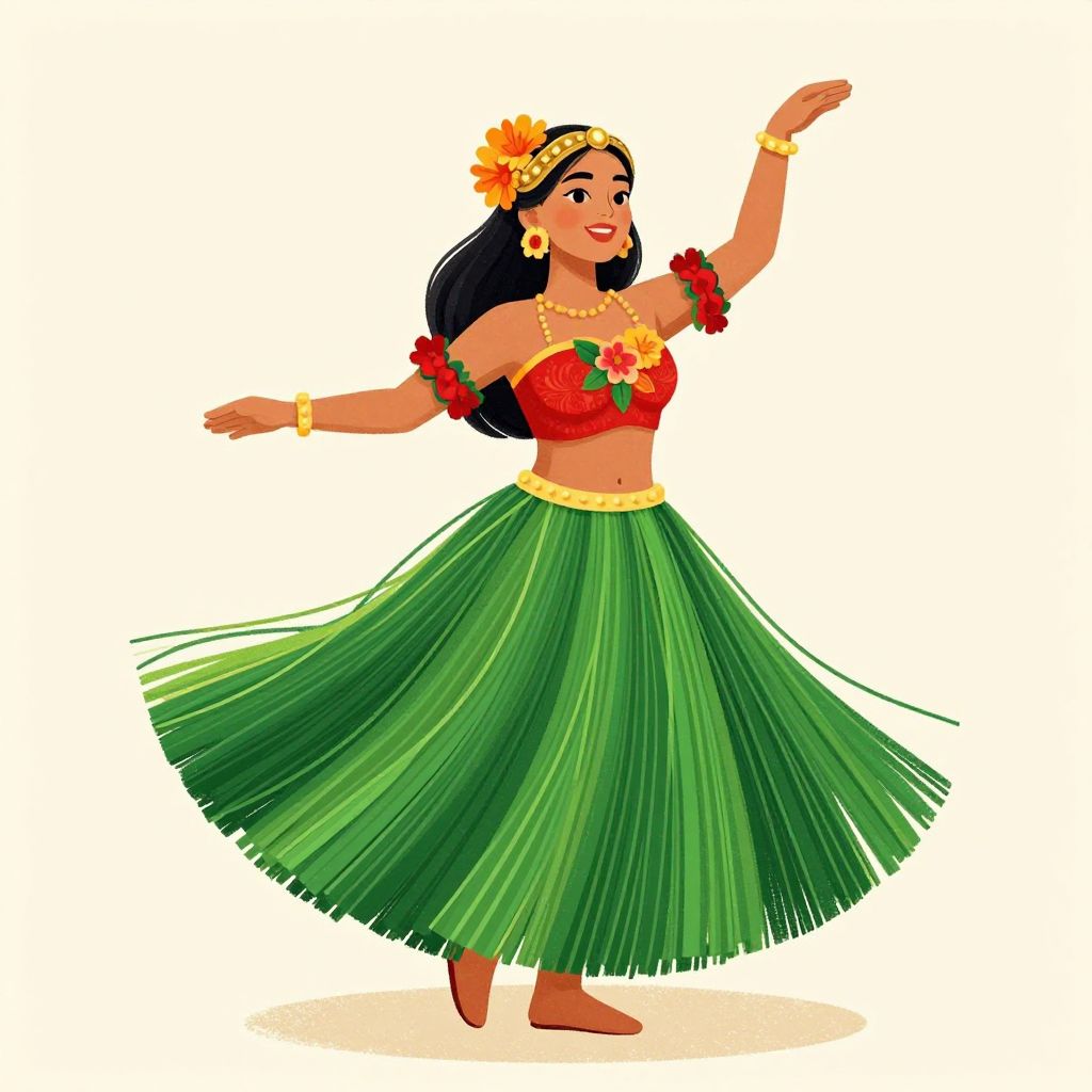 Gracefully dancing hula, a vibrant illustration showcases a woman adorned in traditional attire featuring a flowing green grass skirt, a red top with floral embellishments, and a headpiece with golden accents and orange flowers, set against a soft beige background.