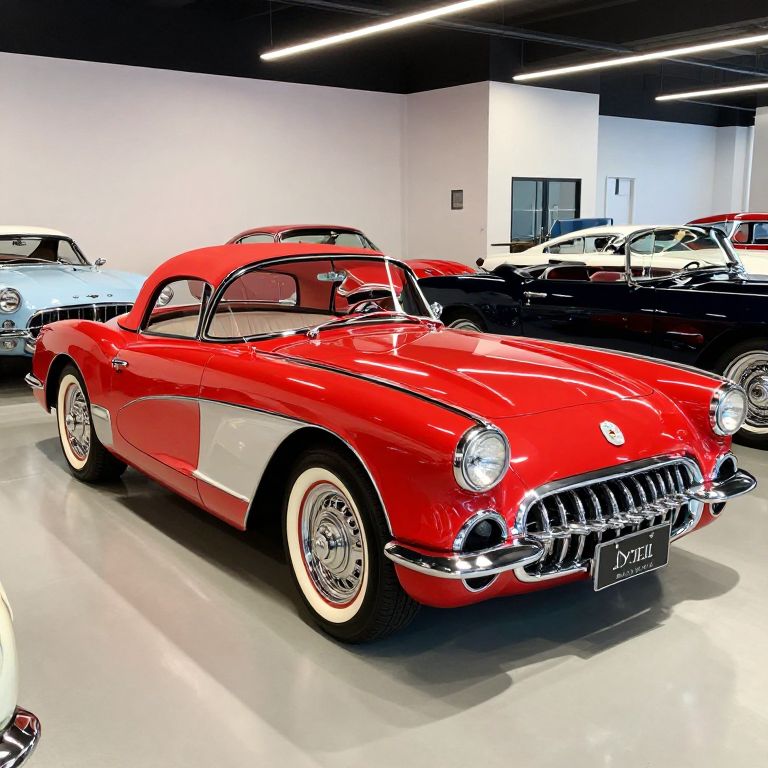 Shiny red 1956 Chevrolet Corvette convertible showcased prominently in a well-lit indoor showroom, surrounded by other classic cars in the background.
