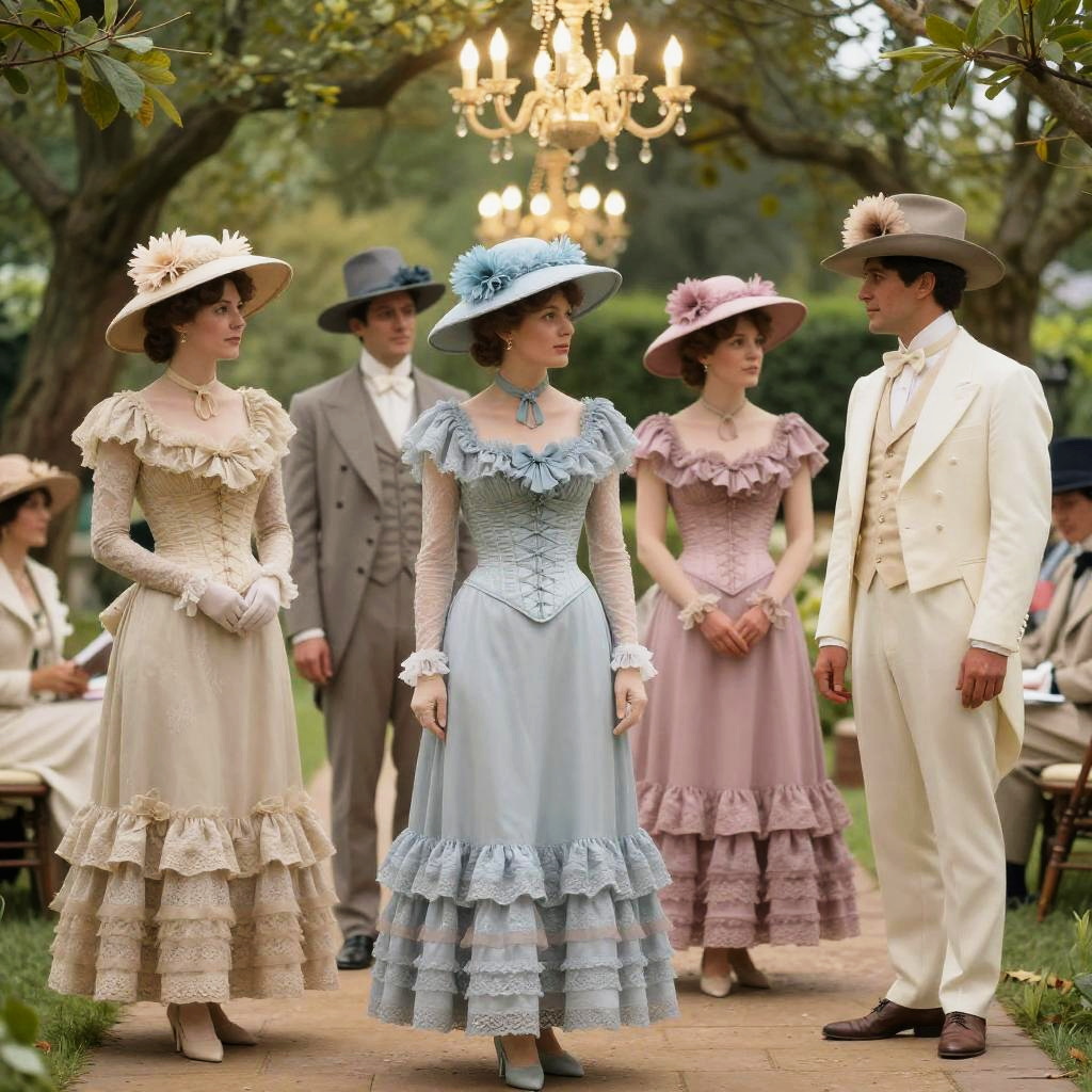 190s vintage fashion showcase, elegantly dressed men and women wearing Edwardian style outfits, wide-brim hats, corsets, layered skirts, outdoor garden party setting with chandeliers hanging from trees, soft pastel color scheme and impressionistic lighting