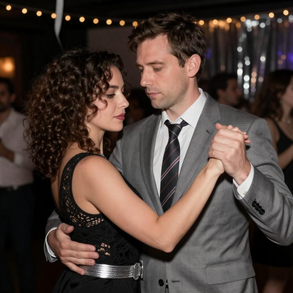 Photograph of a couple in a dimly lit, elegant room. The man, with short brown hair, wears a black suit and white shirt, leaning in to kiss the woman's cheek. She has curly black hair, wears a red dress with a white floral scarf, and holds a drink. They smile at each other, standing close. Dark wooden paneling is in the background.