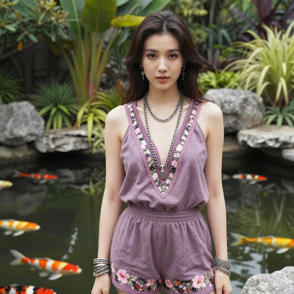 Photograph of an Asian woman with long, dark hair standing in a lush garden by a pond. She wears a sleeveless, lavender romper with a deep V-neck adorned with floral embroidery, and multiple beaded necklaces and bracelets. Her expression is neutral, with slightly parted lips. The background features green foliage, large rocks, and a pond with colorful koi fish. The lighting is natural, highlighting her fair skin and the vibrant colors of her outfit and the fish. The overall scene is serene and picturesque.