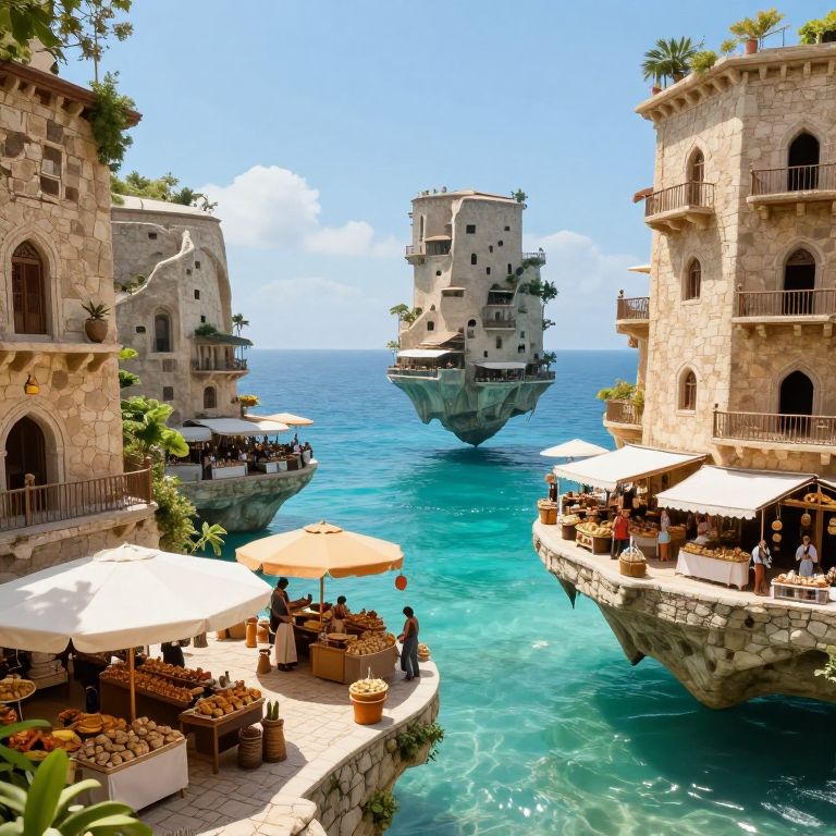 A vibrant marketplace suspended above a shimmering turquoise ocean, where stone-paved stalls float serenely between towering, ancient buildings, defying gravity in a dreamlike, otherworldly setting.