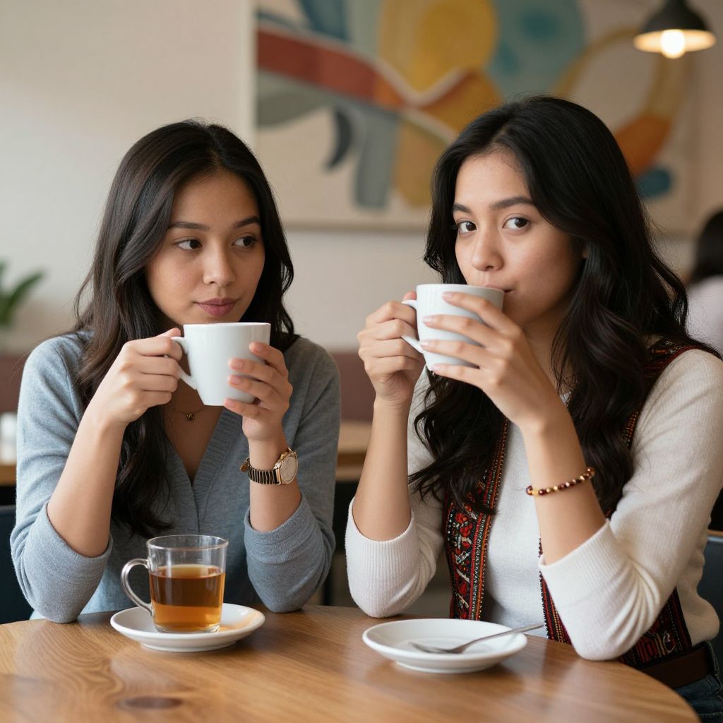 Asian Latina women in a cozy café scene, sipping tea, casual modern outfits with subtle ethnic accessories, warm and inviting lighting, realistic rendering, soft background with artistic touches.