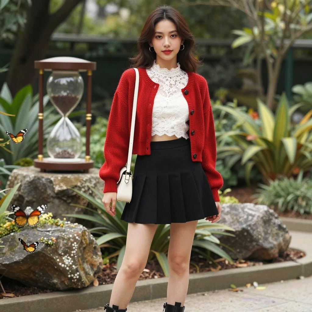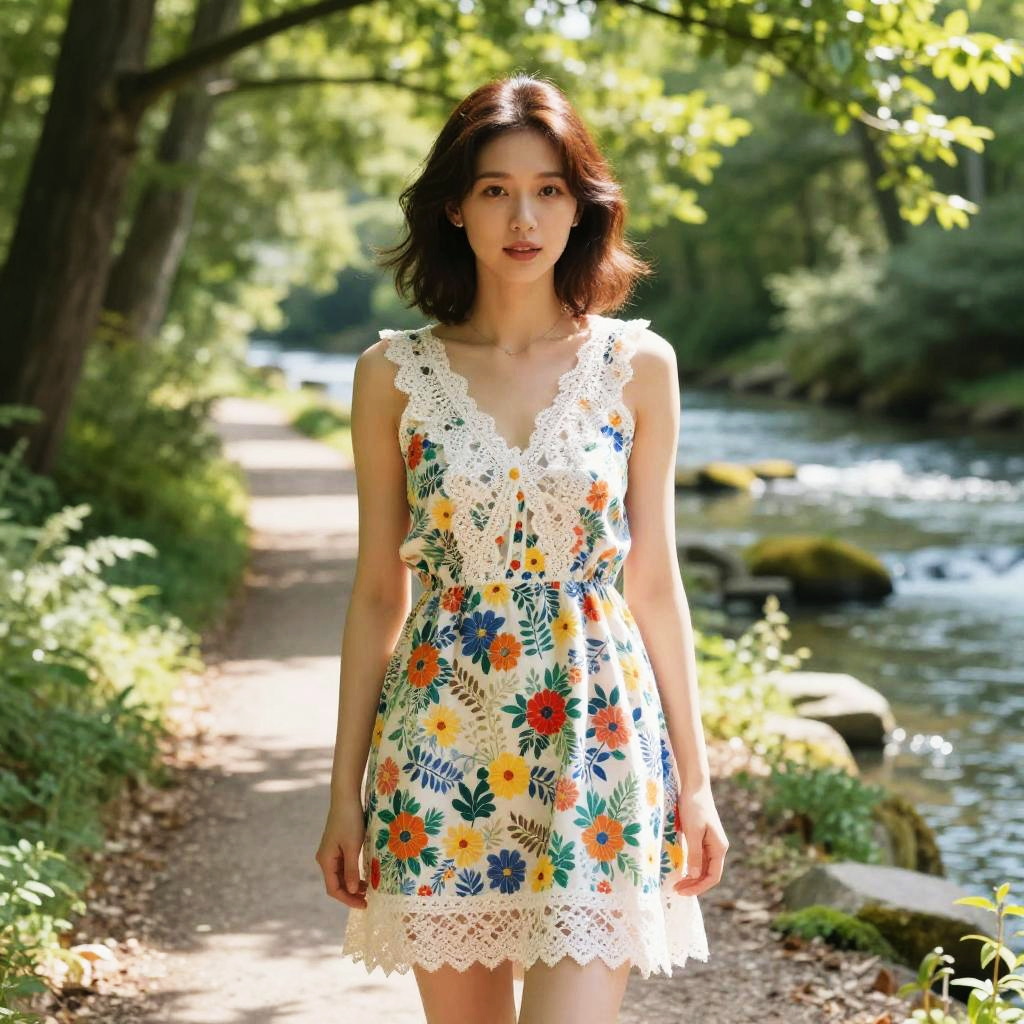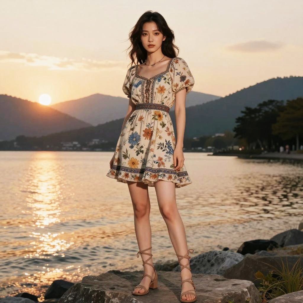 A woman in a bohemian chic sheer off-white lace dress with short flutter sleeves and a braided tassel belt, paired with black lace-up ankle boots, stands in a wildflower meadow, embodying the visual style of Shogakukan. Sexy. Pretty face and beutiful eyes