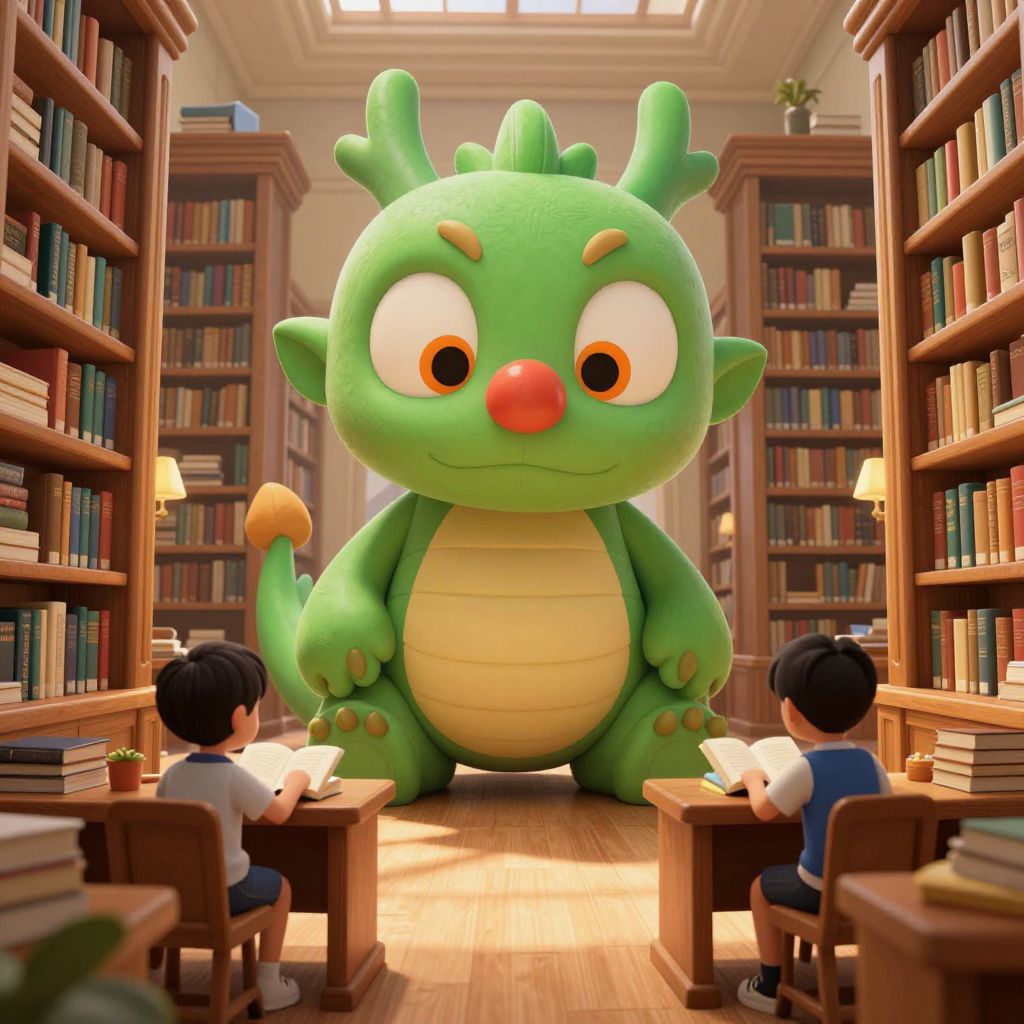 In a whimsical, cartoon-style library filled with towering bookshelves, a colossal green dragon-like creature with vibrant orange eyes and a red nose observes two children engrossed in reading at wooden desks, blending fantasy and imagination in a high-definition digital illustration.