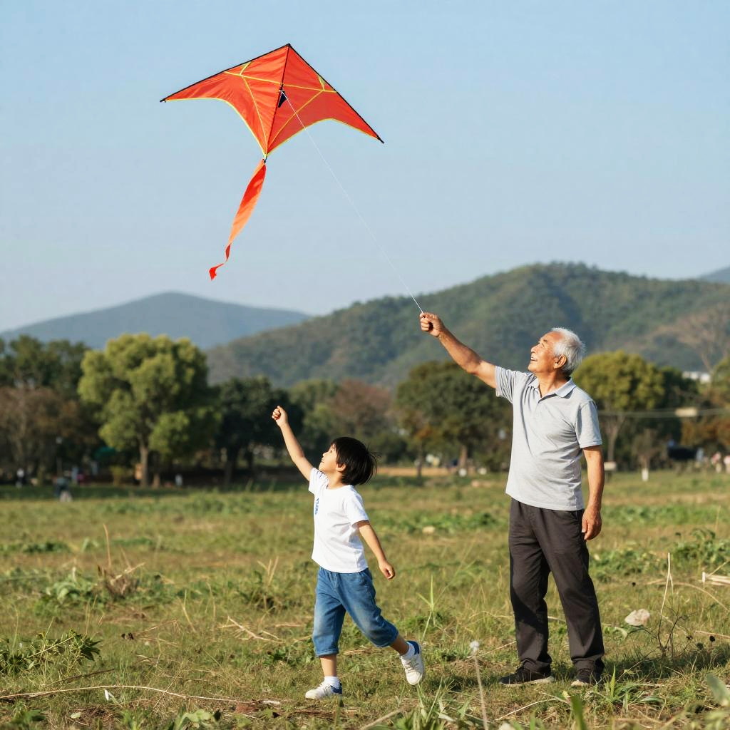 An elderly man and a child flying a bright red kite on a grassy field during a sunny day with clear blue sky, surrounded by green trees and rolling hills in the background, warm natural light illuminating the cheerful and lively scene, soft shadows enhancing the textures of grass and clothing