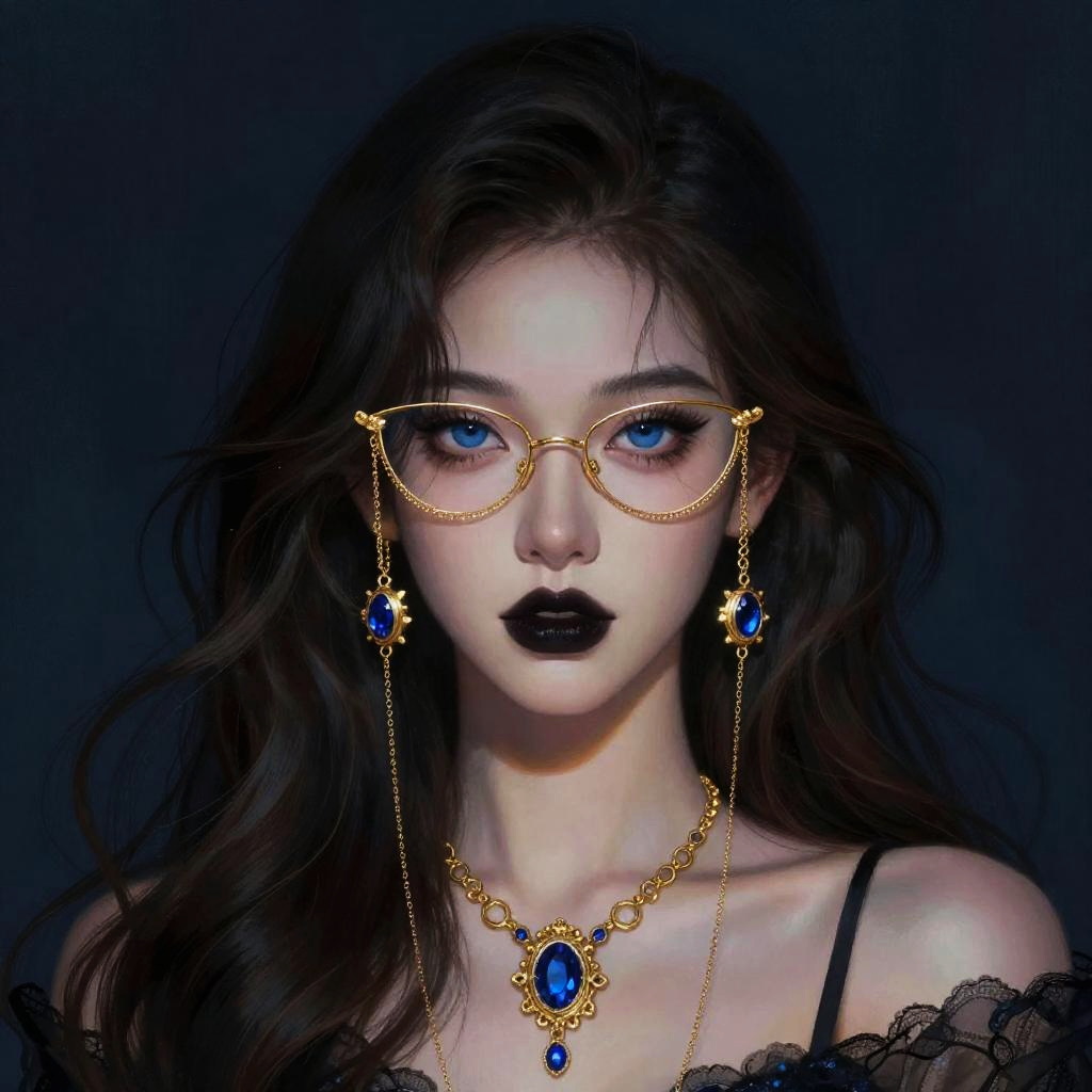 Digital painting of a mysterious woman with long, wavy dark brown hair. She has striking blue eyes, wearing gold, cat-eye glasses with delicate chains. Her makeup is bold with dark lips. She's adorned with ornate gold earrings featuring blue gemstones and a matching necklace. The background is a dark, textured blue, enhancing her ethereal, captivating presence. The lighting highlights her facial features and jewelry, adding a magical vibe.
