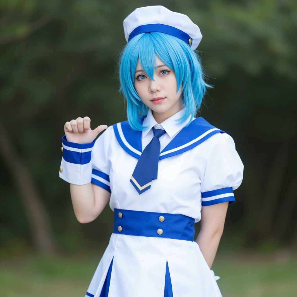 Photograph of a young woman with blue hair in a white and blue anime-style sailor uniform, standing outdoors with a forest background. She waves with a
