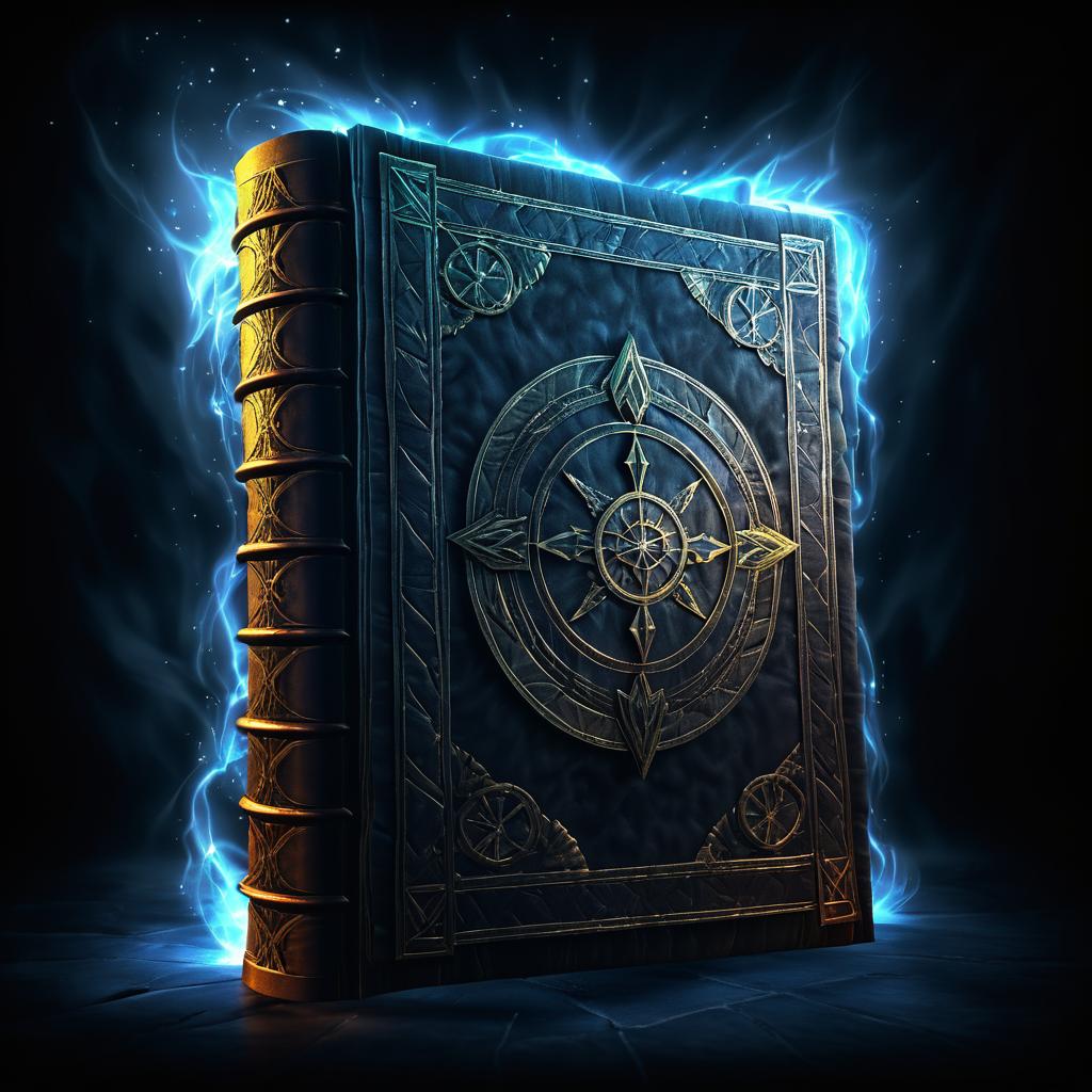 A detailed close-up of an ancient tome with an ornate blue cover featuring an intricate glowing emblem in the center. The tome emits intense orange and yellow magical glowing effects against a dark background, emphasizing its mystical and enchanted nature.