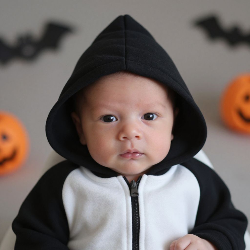 Photograph of a light-skinned baby with round, dark eyes and a neutral expression, wearing a black and white hooded jacket with a black hood. The baby is centered in the image, with a slightly blurred gray background featuring two orange jack-o'-lanterns and two black bat decorations. The baby's skin is smooth and slightly pink, and the hood is slightly oversized, covering part of the baby's head. The jacket is soft-textured, with white on the chest and black sleeves and hood. The lighting is even, highlighting the baby's face and outfit.