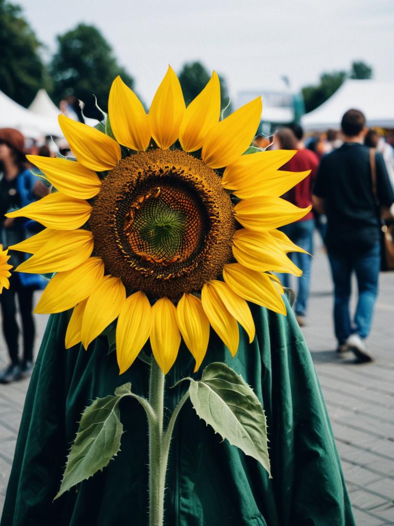Person with Sunflower Costume, playful cosplay festival portrait, photorealistic realism