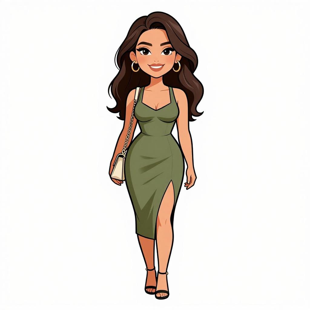 Illustration of a smiling young woman with long dark hair, wearing an olive green bodycon midi dress featuring a plunging neckline, sleeveless design, and a front slit. She accessorizes with gold hoop earrings, a beige shoulder bag with a chain strap, and nude strappy heels.