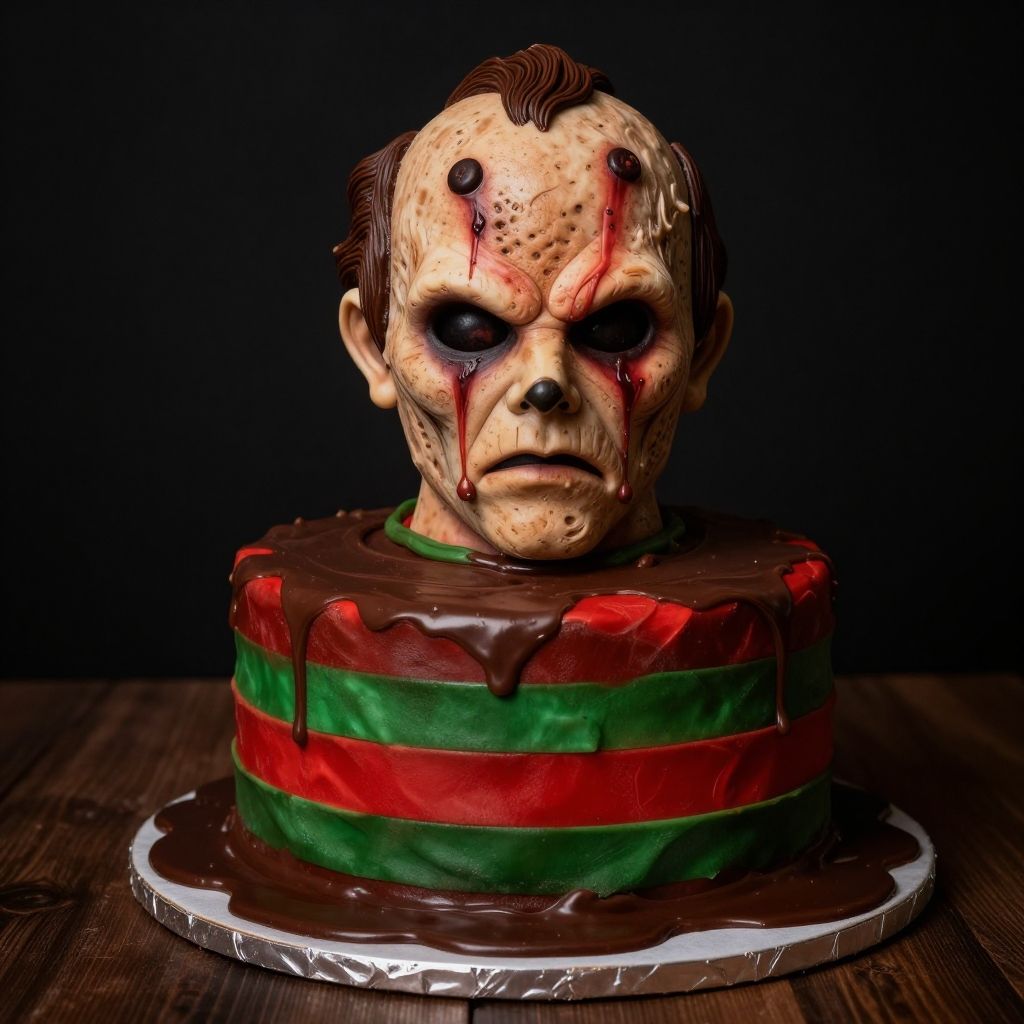 Freddy Krueger cake ideas showcasing a creepy head sculpture cake with melted chocolate and red and green stripes, realistic texture, eerie lighting