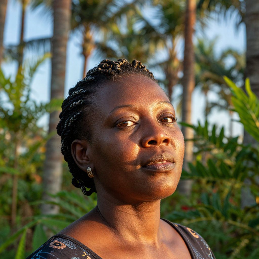Photograph of a dark-skinned African woman with short, braided hair, standing outdoors. She has a serious expression, gazing slightly upward. Her skin glows in the sunlight, highlighting her facial features. She wears a dark, patterned top with silver hoop earrings. The background consists of tall palm trees and lush green foliage, with sunlight filtering through, creating a warm, natural setting. The image focuses on her face, with a slight blur on the background, emphasizing her presence and expression. The lighting casts soft shadows, adding depth to her features.