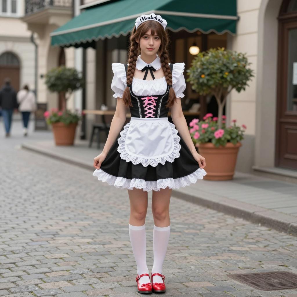 Premium queen hearts girl, photograph of a young woman standing in a sunlit hallway, wearing a gothic princess dress with white puffed sleeves, black bodice with pink heart patterns, and a black skirt with pink hearts, pink crown on her head, black lace-up shoes, blonde hair in a side braid, serious expression, natural light, blurred background with pillars and greenery, fashion runway style, full body shot, daytime, semi-realistic lighting, shallow depth of field
