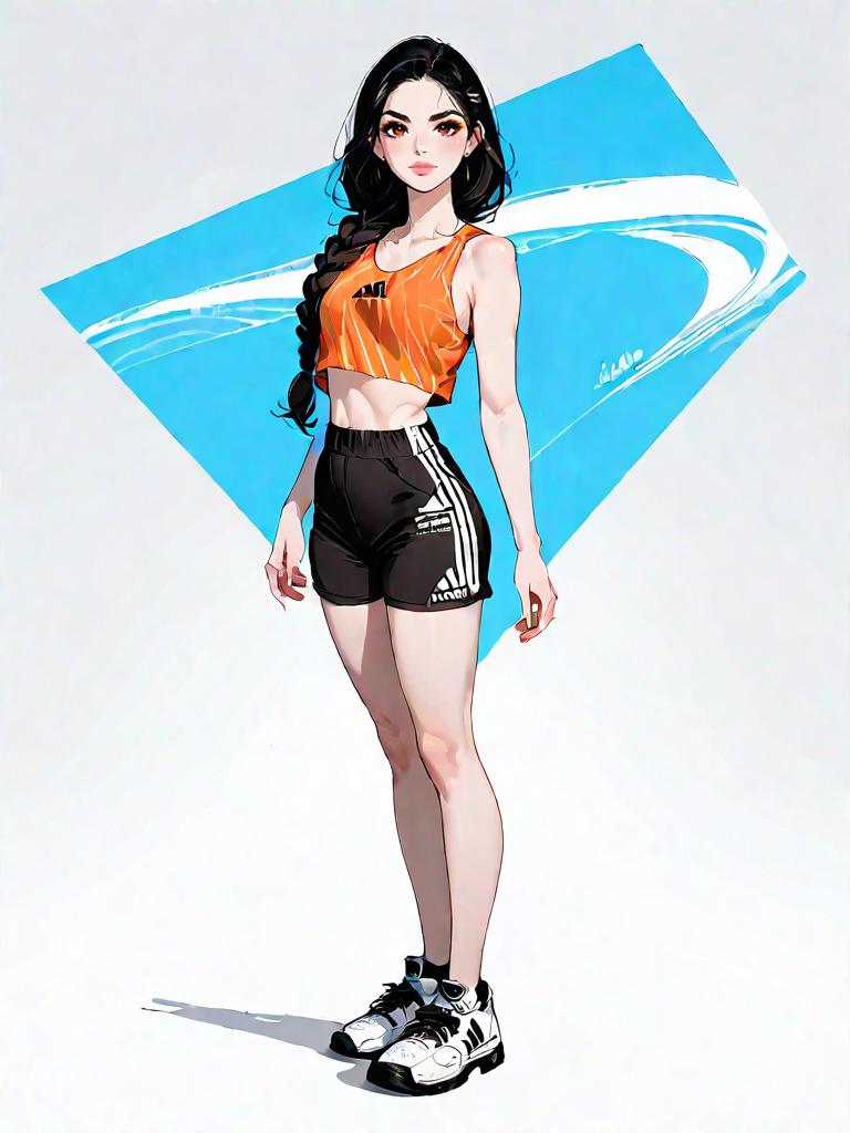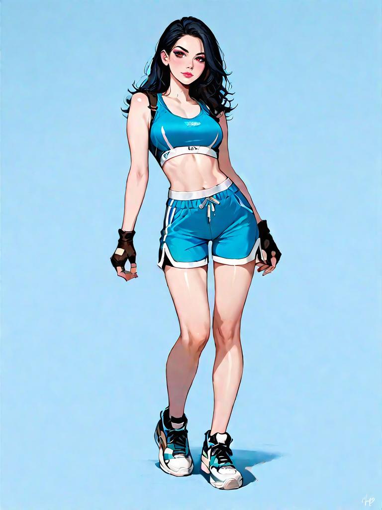 Full body illustration of a young athletic woman with long black hair wearing a coordinated two-piece workout ensemble consisting of a heathered blue crop tank top with thin straps and matching high-waisted biker shorts. She is also wearing black fingerless gloves and sporty sneakers, standing against a plain light blue background.
