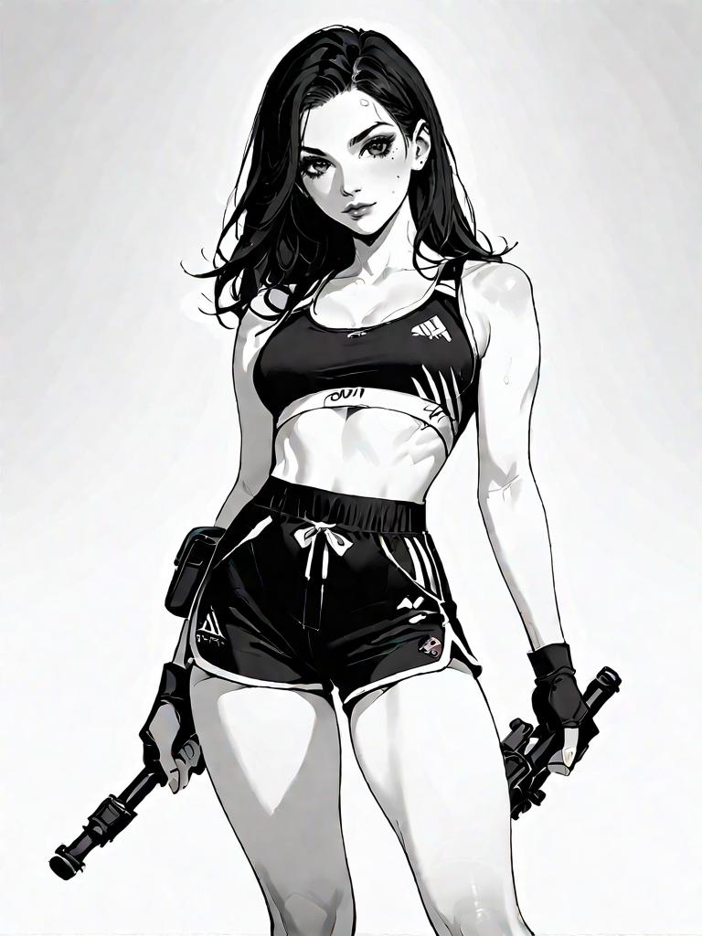1girl, source_comics, realistic face, full body shot, Woman, athletic wear, coordinated two-piece workout ensemble in heathered blue, crop tank top with thin straps, matching high-waisted biker shorts, black fingerless gloves with text detail, natural hair styled in a headwrap, minimalist white studio background