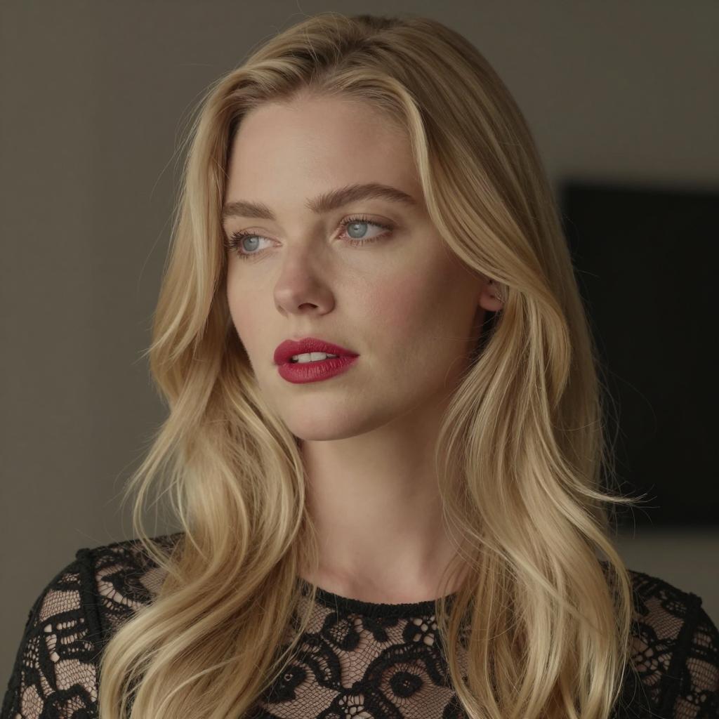 Close-up photograph of a woman with long, wavy blonde hair, fair skin, and red lipstick. She gazes to the left with a neutral expression. She wears a black lace top. Dark, out-of-focus background. Soft lighting highlights her face and hair.
