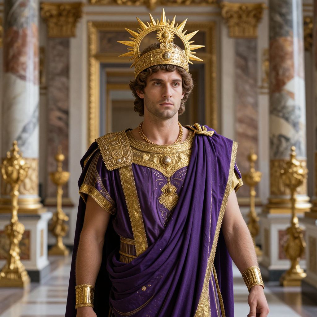Elagabalus, ancient Roman emperor depicted in lavish purple and gold robes, ornate headdress with sun motifs, opulent palace background with marble columns and golden artifacts, dramatic lighting, baroque style, intricate details