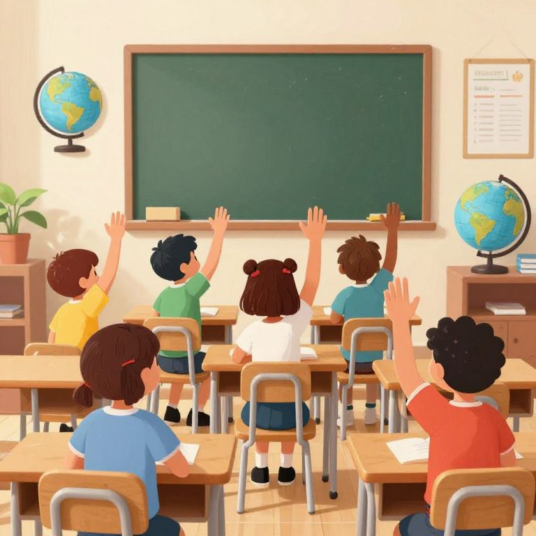 This digital illustration depicts a vibrant classroom scene with seven diverse children, of varying skin tones and hair colors, raising their hands towards a large green chalkboard. They are seated at wooden desks with metal chairs, wearing colorful shirts and shorts. Two globes, one on each side of the chalkboard, and a potted plant on the left add educational elements. A schedule or list hangs on the right wall. The children's expressions and raised hands convey eagerness and engagement. The background is light beige, emphasizing the classroom's bright and welcoming atmosphere.