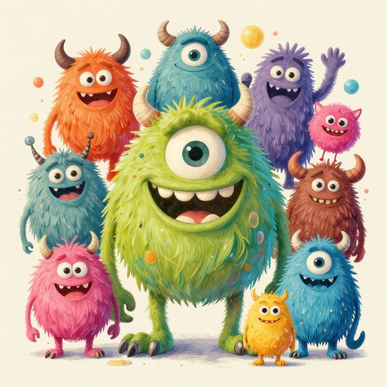 The image is a vibrant and playful illustration featuring a group of mischievous monsters, reminiscent of the whimsical style of artists like Maurice Sendak and EH. Shepard. The scene is teeming with a variety of creatures, each with distinct features and expressions, creating a lively and dynamic composition. The largest monster, positioned centrally, has a greenish hue with large, round eyes and a wide, toothy grin, exuding a sense of mischief. Surrounding this central figure are smaller monsters in various colors, including blue, pink, and brown, each with unique textures and accessories, such as antennas or horns. The monsters are arranged in a somewhat circular formation, with some appearing to be in motion, adding to the playful and mischievous atmosphere. The background is a simple, light beige, which helps to highlight the colorful and detailed monsters. The overall composition is balanced, with the monsters evenly distributed across the frame, creating a sense of harmony and unity. The illustration is signed by Laura Watson and EH. Shepard, further emphasizing its artistic quality and inspiration from renowned illustrators.