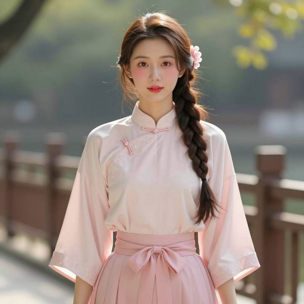 Pastel attire female costume, photo of Asian woman, long braided brown hair, pink floral hair clip, wearing pastel pink Qing dynasty-style blouse and skirt, puffed sleeves, three buttons on blouse, pink bow on skirt, standing outdoors, sunlight, blurred greenery and wooden fence in background, neutral expression, makeup with pink blush and red lipstick, earrings, daytime, realistic, detailed, natural lighting, soft colors, portrait, front view