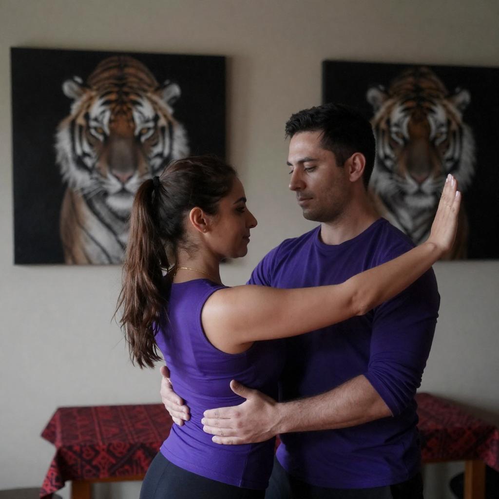 Photograph of a man and woman dancing in a dimly lit room. The woman, with long brown hair in a ponytail, wears a sleeveless purple top and a gold bracelet, extends her right arm forward. The man, with short dark hair, wears a purple long-sleeve shirt and stands close behind her, his left hand on her waist. Behind them, two large black-and-white tiger paintings hang on the wall. A wooden table with a red-patterned cloth is in the background.