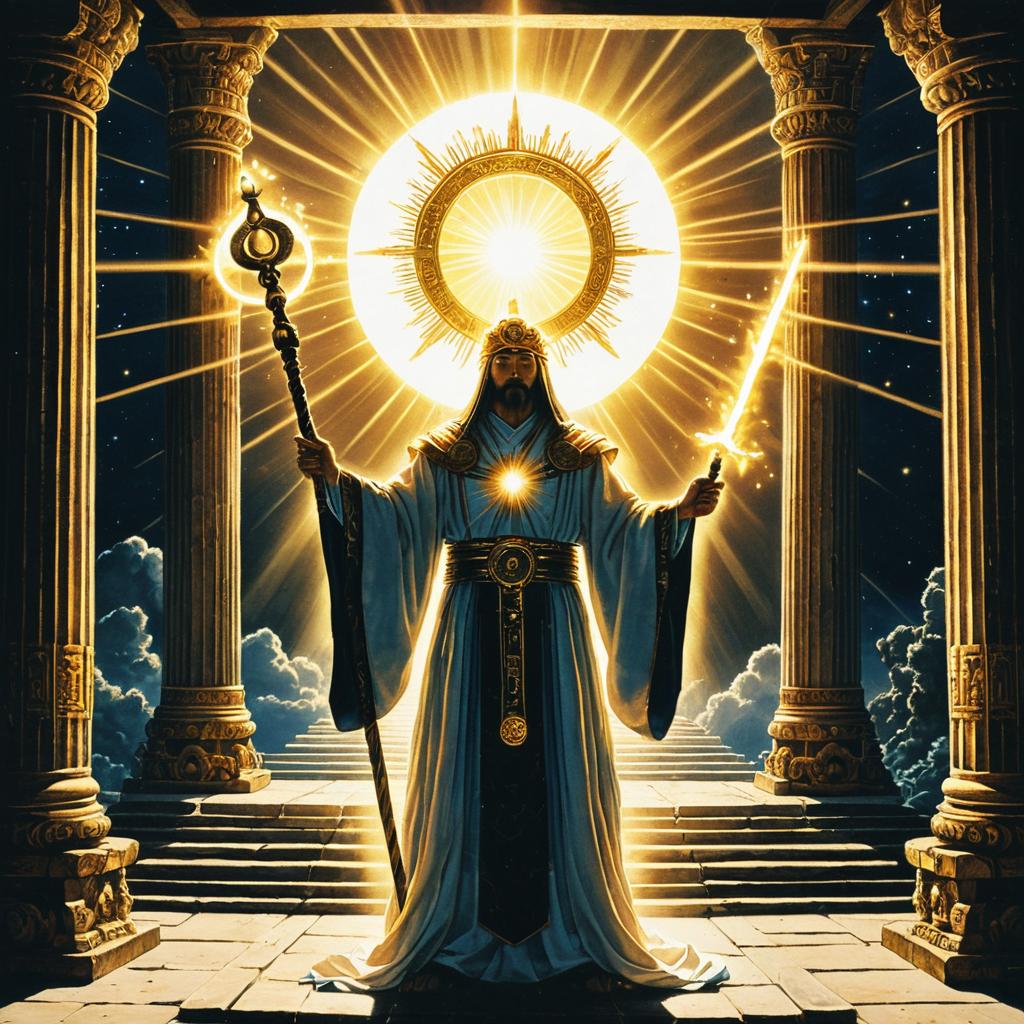 A celestial priest, with a radiant golden halo and staff glowing with divine light, engaging in a solemn ritual summoning celestial entities, set in an ancient temple at sunrise with beams of heaven, depicted in the surreal and highly detailed style of Hirohiko Araki.
