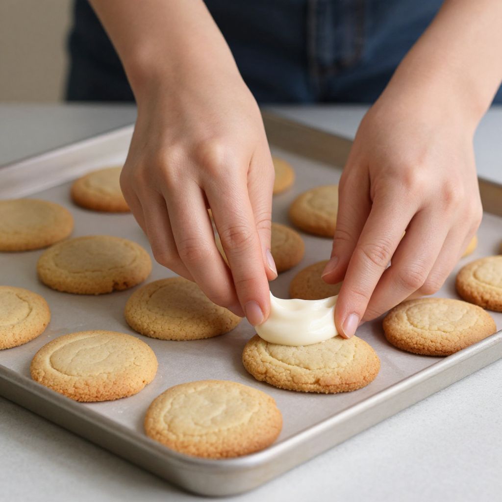 Close-up photograph of hands placing a dollop of white frosting on a golden-brown cookie on a metal baking tray.