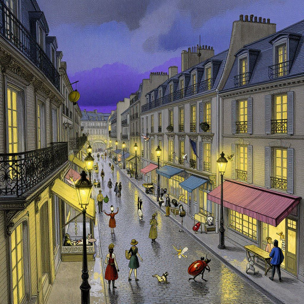 Craft an image showcasing intricate line work and vibrant color palettes reminiscent of Gustave Doré's artwork. Depict a whimsical aerial view of a lively 19th-century Parisian street on a rainy day. The scene should feature detailed architectural elements such as ornate wrought iron balconies, gas lamps, and cobblestone streets, illuminated by the warm glow of lamplight against a dramatic stormy backdrop with vivid purple and blue hues. Incorporate various characters and animals engaging in daily activities to capture the lively atmosphere, juxtaposing the elegance of Parisian culture with fantastical elements like oversized beetles or playful fairies fluttering among awnings and windows.