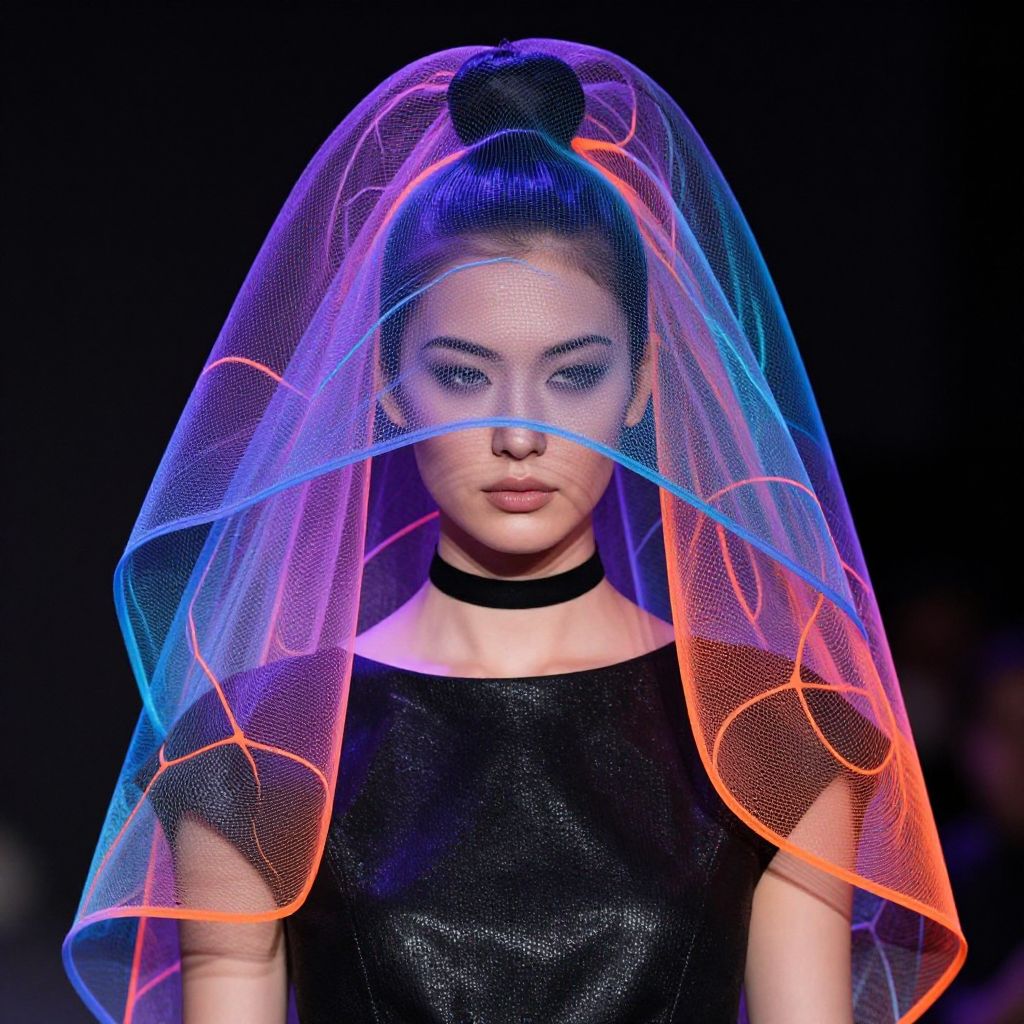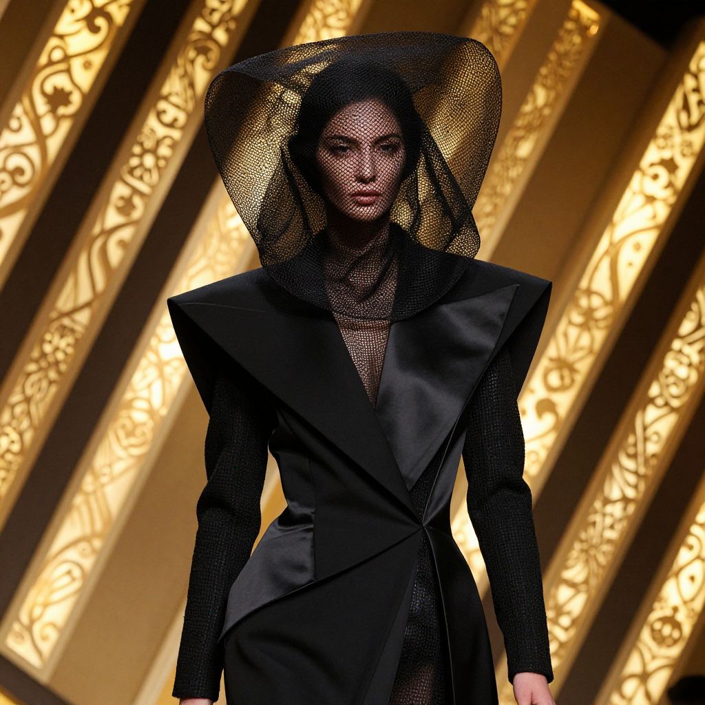 A hyper-realistic portrait of a woman in avant-garde fashion couture, wearing an asymmetrical black ensemble that masterfully blends futurism, urban streetwear, and the refined sophistication of Milan Fashion Week 2023, Her outfit features dramatic angular cuts and layered textures, juxtaposing glossy and matte finishes to evoke depth and modernity, Her head is loosely enveloped in a surreal, exaggerated mesh covering that creates ample space around her face, transforming into a sculptural veil that exudes mystery and artistic innovation, The mesh’s intricate, interwoven design casts delicate patterns of light and shadow on her features, teasing glimpses of her expression while emphasizing the ethereal contours of her form, The background displays a dozen diagonal frames with ornate golden patterns, their glowing intricacy providing a luminous, geometric contrast to her minimalist black attire, Cinematic lighting enhances the interplay of textures, softly illuminating the golden elements while accentuating the enigmatic aura of the mesh covering, Rendered in 8K ultra-HD, every detail—from the fine textures of the attire to the intricate geometry of the backdrop—is meticulously captured, creating a seamless fusion of modern couture and surreal elegance, Niji Stan Katayama Style