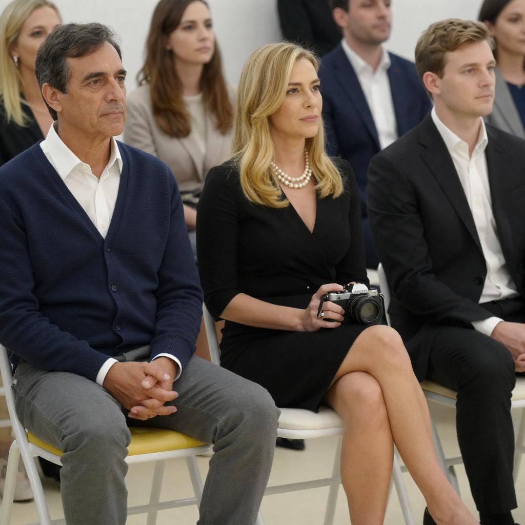 Photograph of two scenes. Left: middle-aged man with dark hair, wearing blue cardigan over white shirt, sitting in yellow chair. Right: woman with blonde hair in black dress and pearl necklace, holding camera, seated next to man in black suit, both looking forward. Background includes blurred people and white chairs.