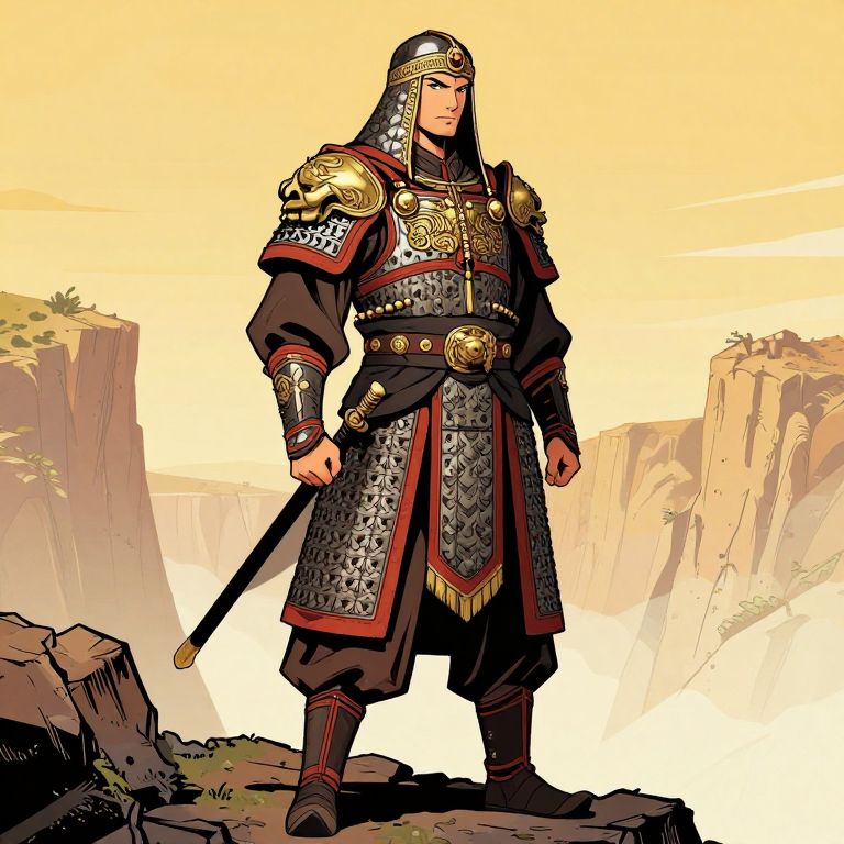 A Russian warrior in ornate armor with Chinese and Persian influences stands on a cliffside, graphic novel style.