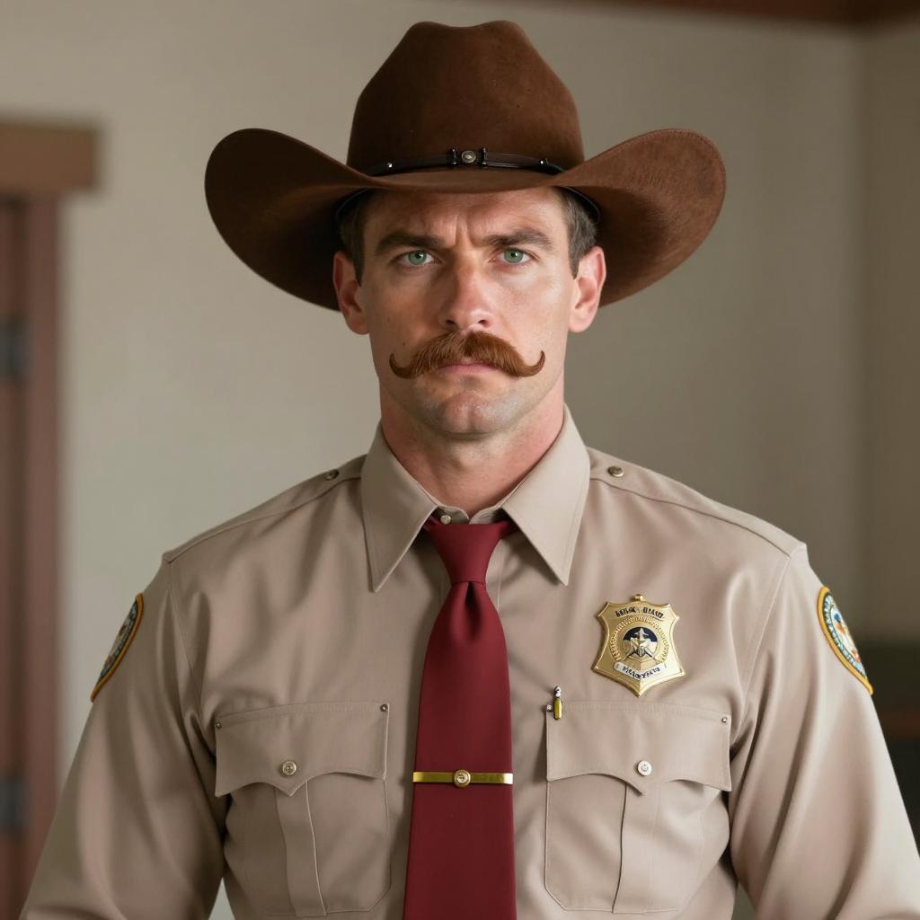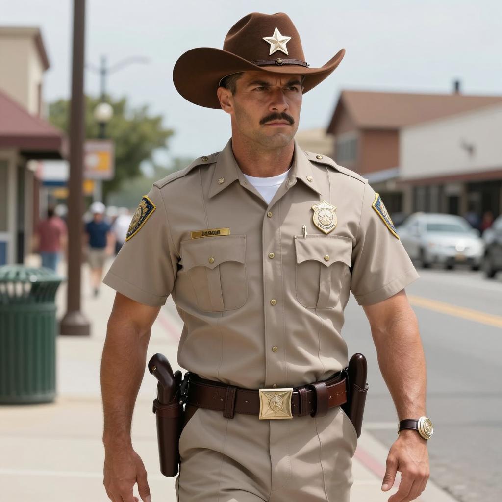 Photograph of a plus size middle-aged white man wearing a green military-style uniform with a brown belt and brown bucket hat. The man stands outdoors in front of a brick wall with green tree foliage in the background. He has a serious expression and is wearing a black strap across his chest and patches on his sleeve. The uniform details are clearly visible in daytime sunlight.