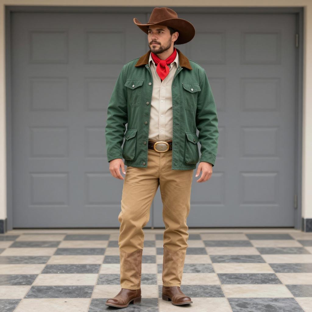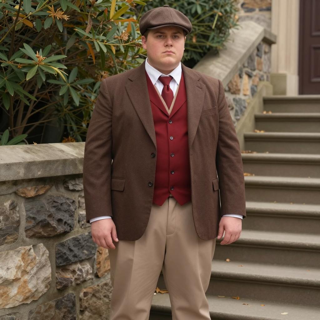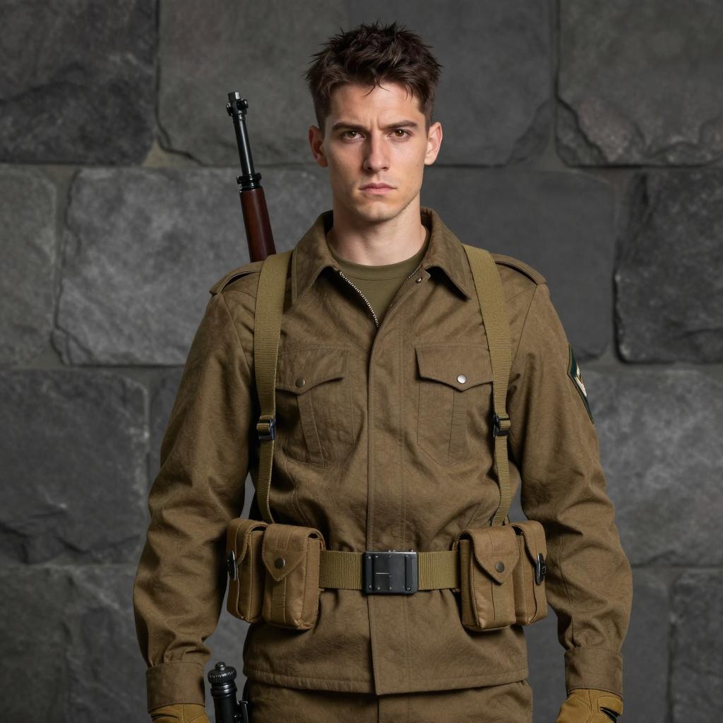 Plus size soldier costume, photograph of a chubby, middle-aged white man standing in front of a brick wall, wearing a green military-style uniform with a brown belt, brown bucket hat, black strap across chest, patches on sleeve, daytime, sunlight, serious expression, background has green tree foliage, realistic style, outdoor setting, uniform details clearly visible